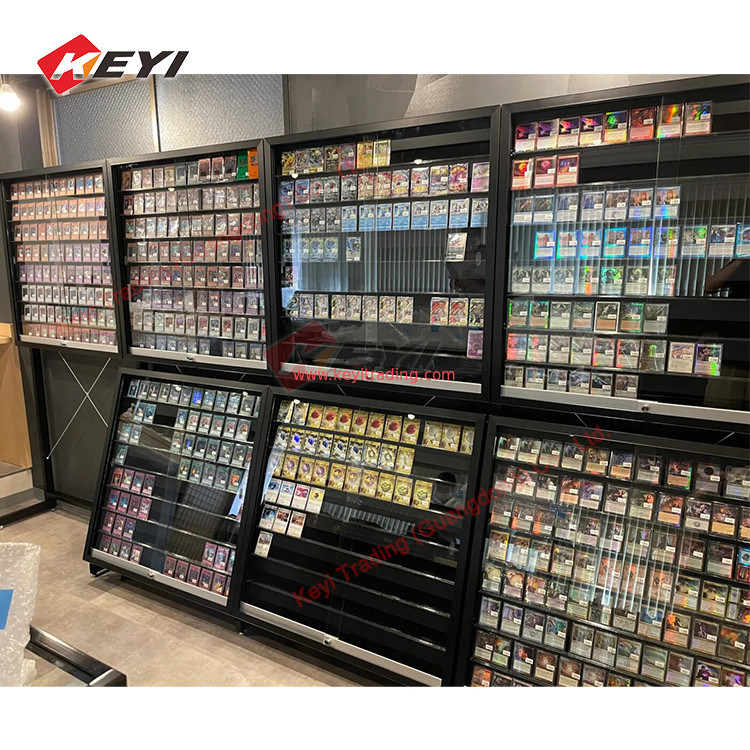This retail display case is designed for graded trading and sports card displays, featuring adjustable height shelves and lockable doors. It is made of metal, acrylic and customizable materials, suitable for retail stores, supermarkets, shopping malls, and exhibitions, trade show, ect. It fits motst of style cards, such as PSA card, TCG card, graded cards with slab, standard Pokemon cards and so on. The knock-down construction saves shipping costs and ensures easy assembly with an instruction sheet. Custom sizes and colors are available, making it versatile for various indoor applications.